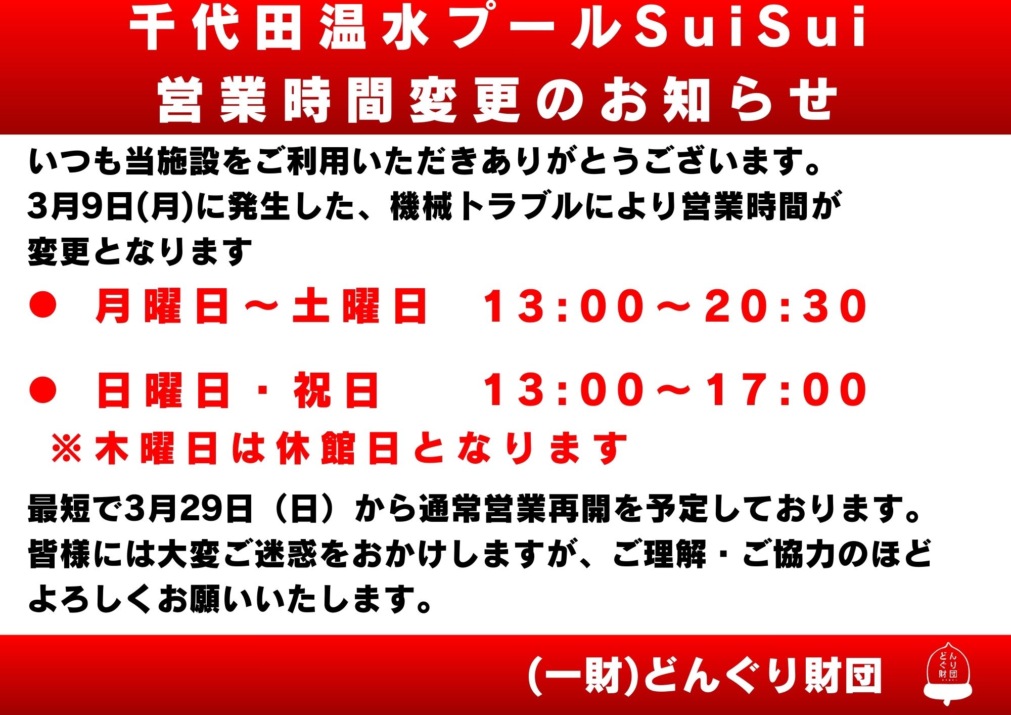 最短で3月29日(日)から通常営業再開を予定しております。